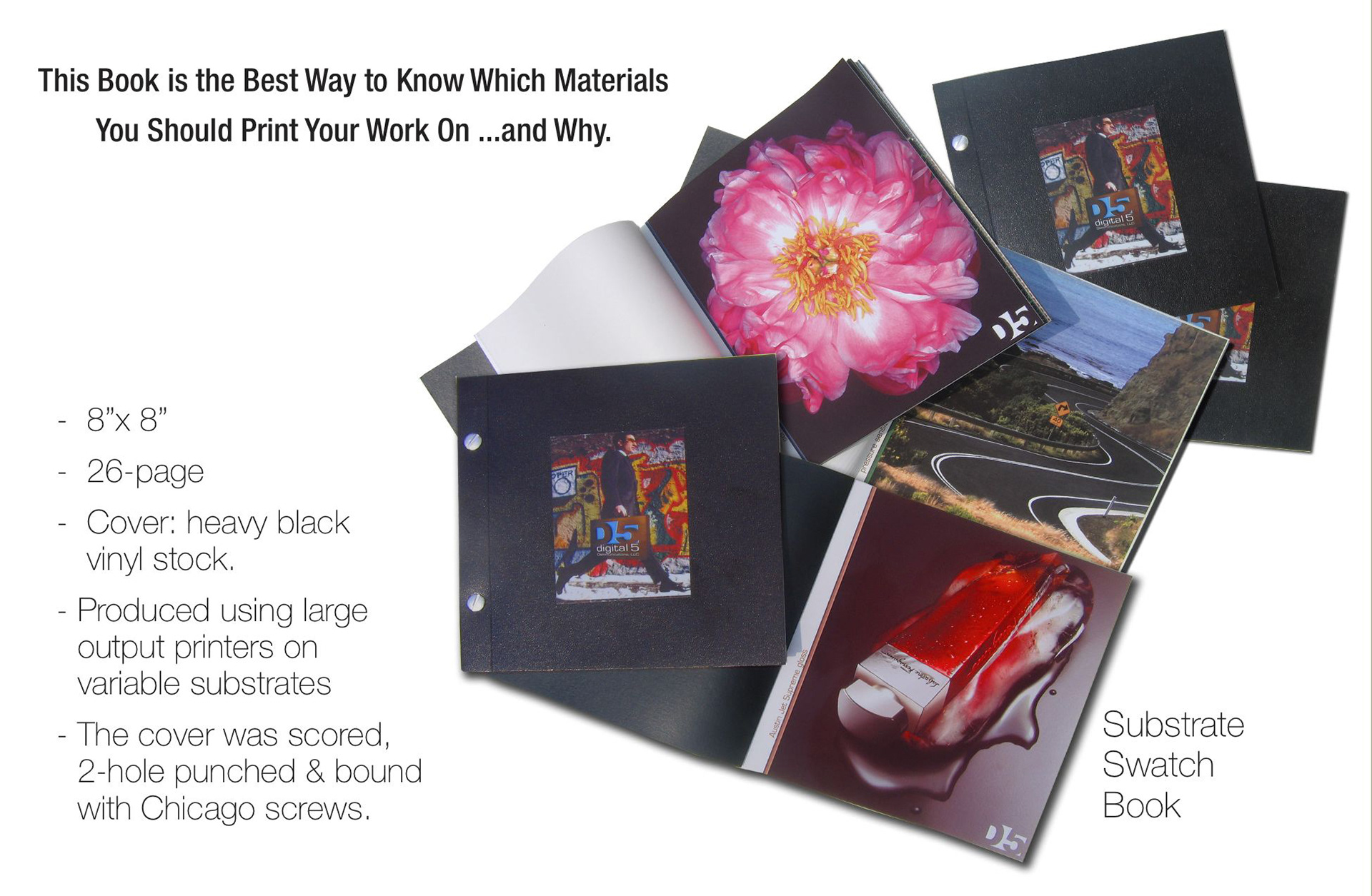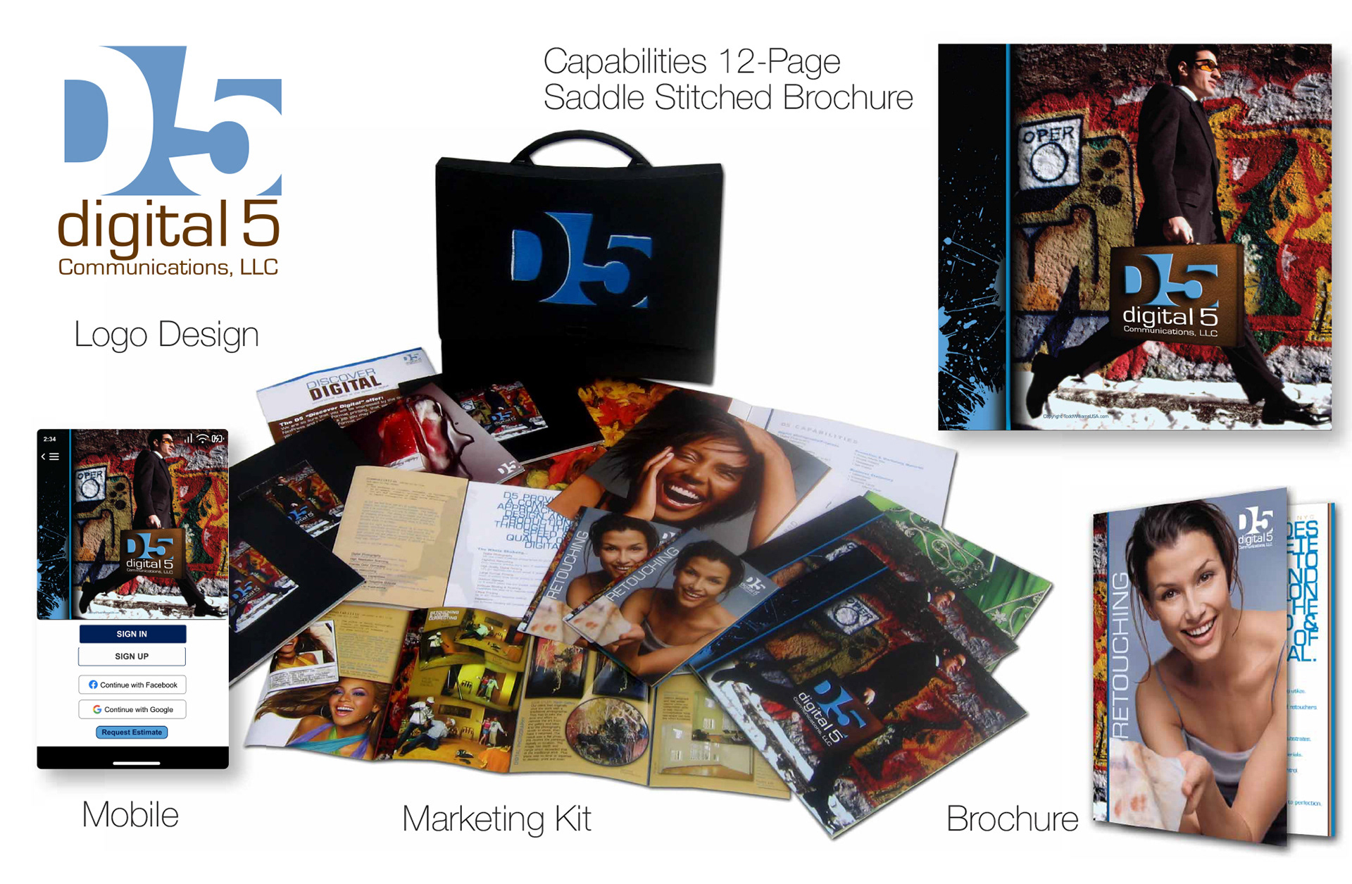Creative Seven created the Digital 5 logo, designed a capabilities brochure, retouching brochure, substrate swatch book, D5 offer sheet and a spray-painted suitcase kit to carry the collateral material sent to prospects. The response rate was greater than 50%.